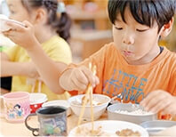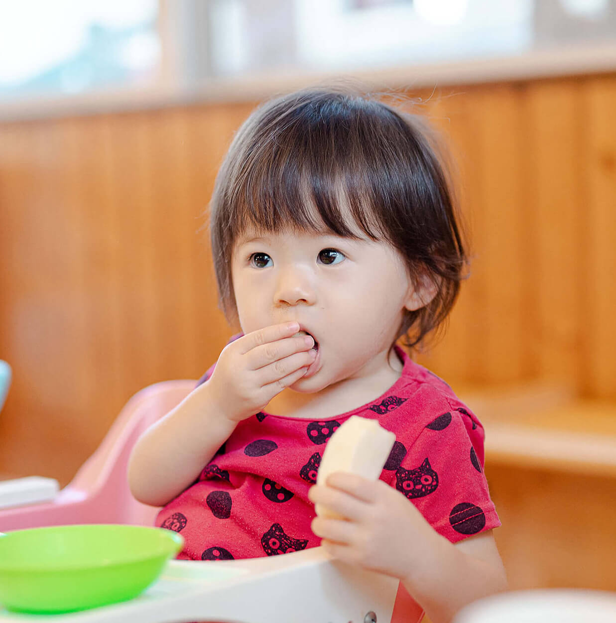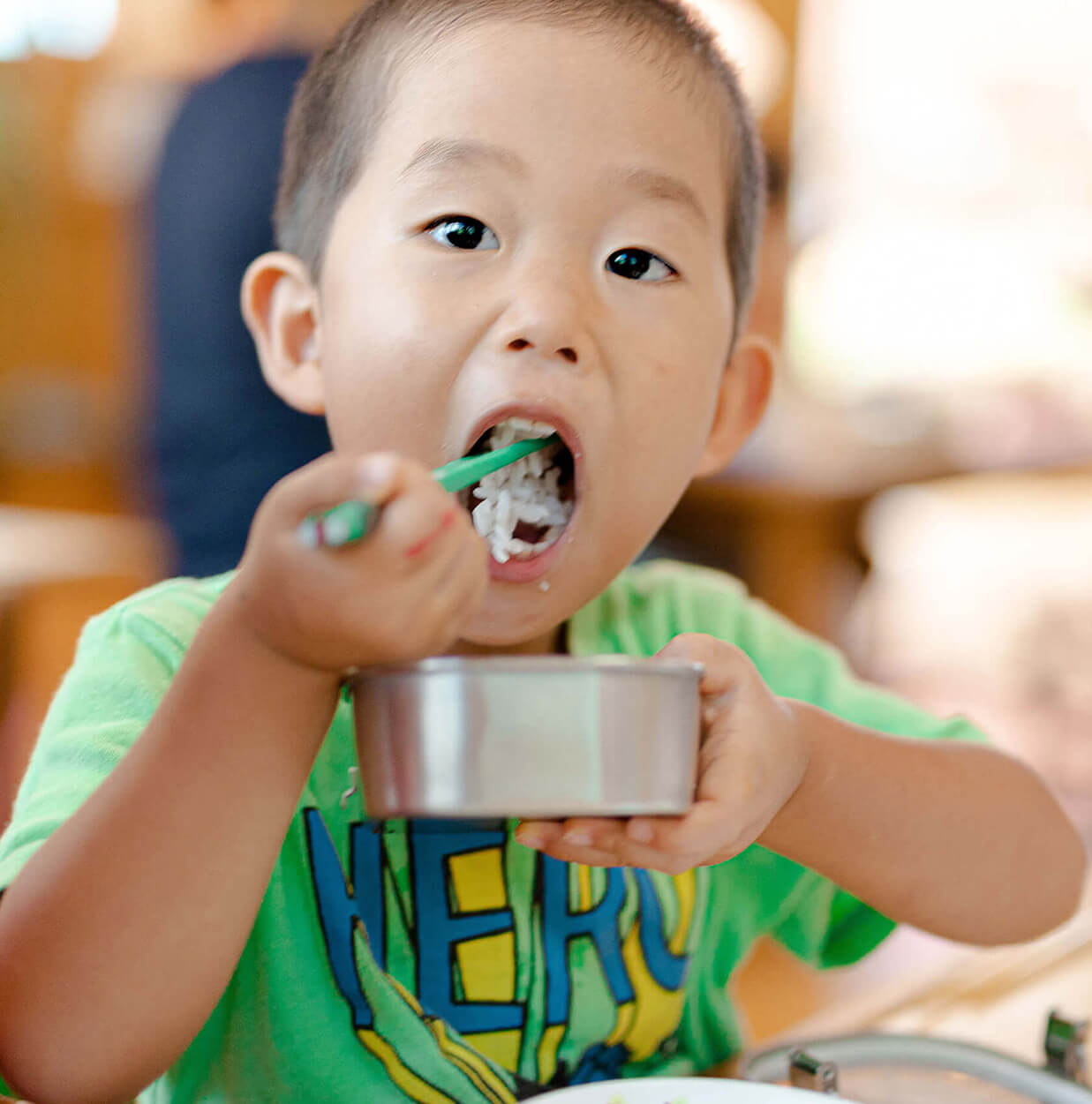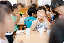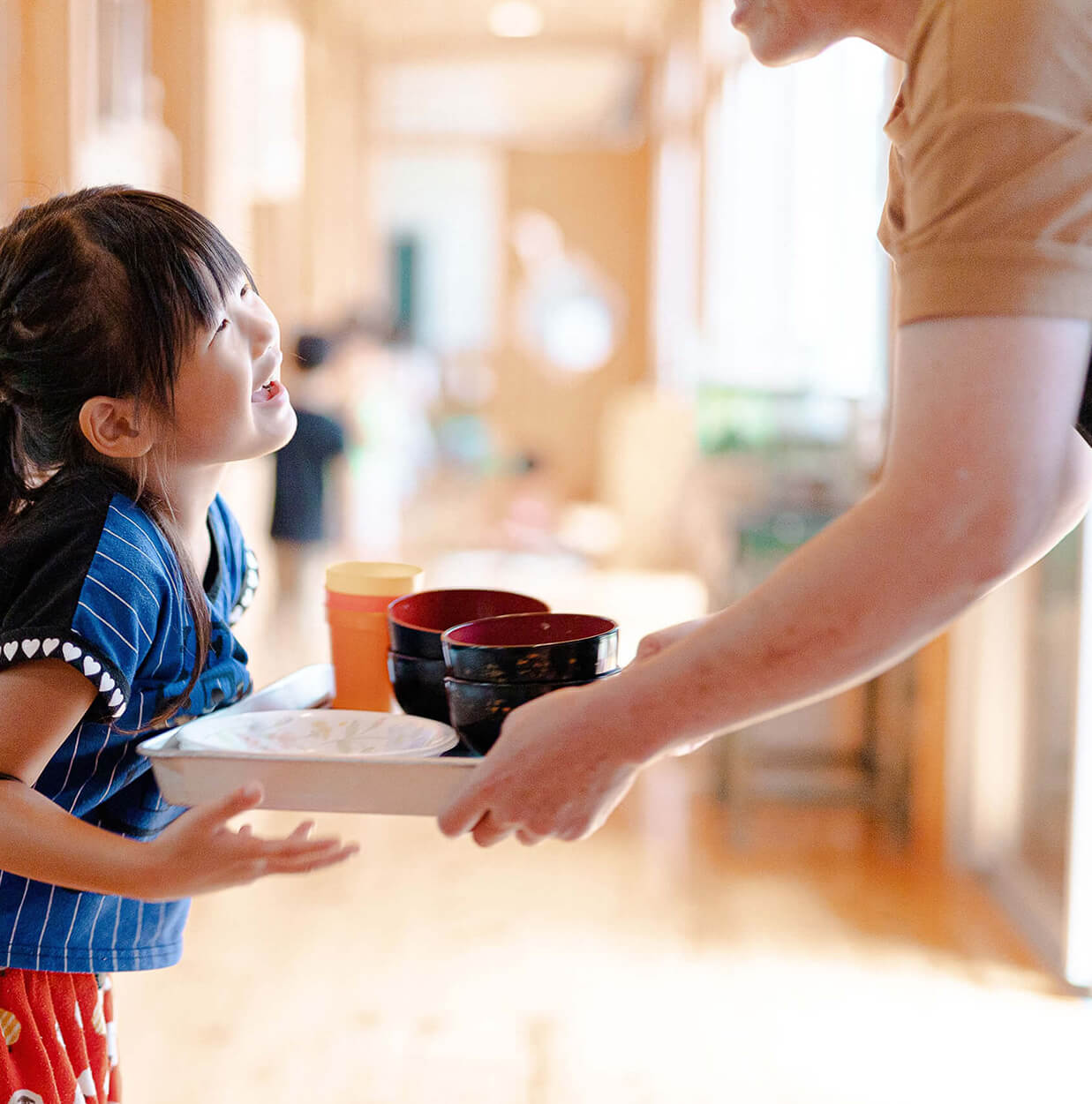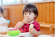 毎日の給食とおやつを、子ども達と一緒に楽しむことで食の成長を見守ります。